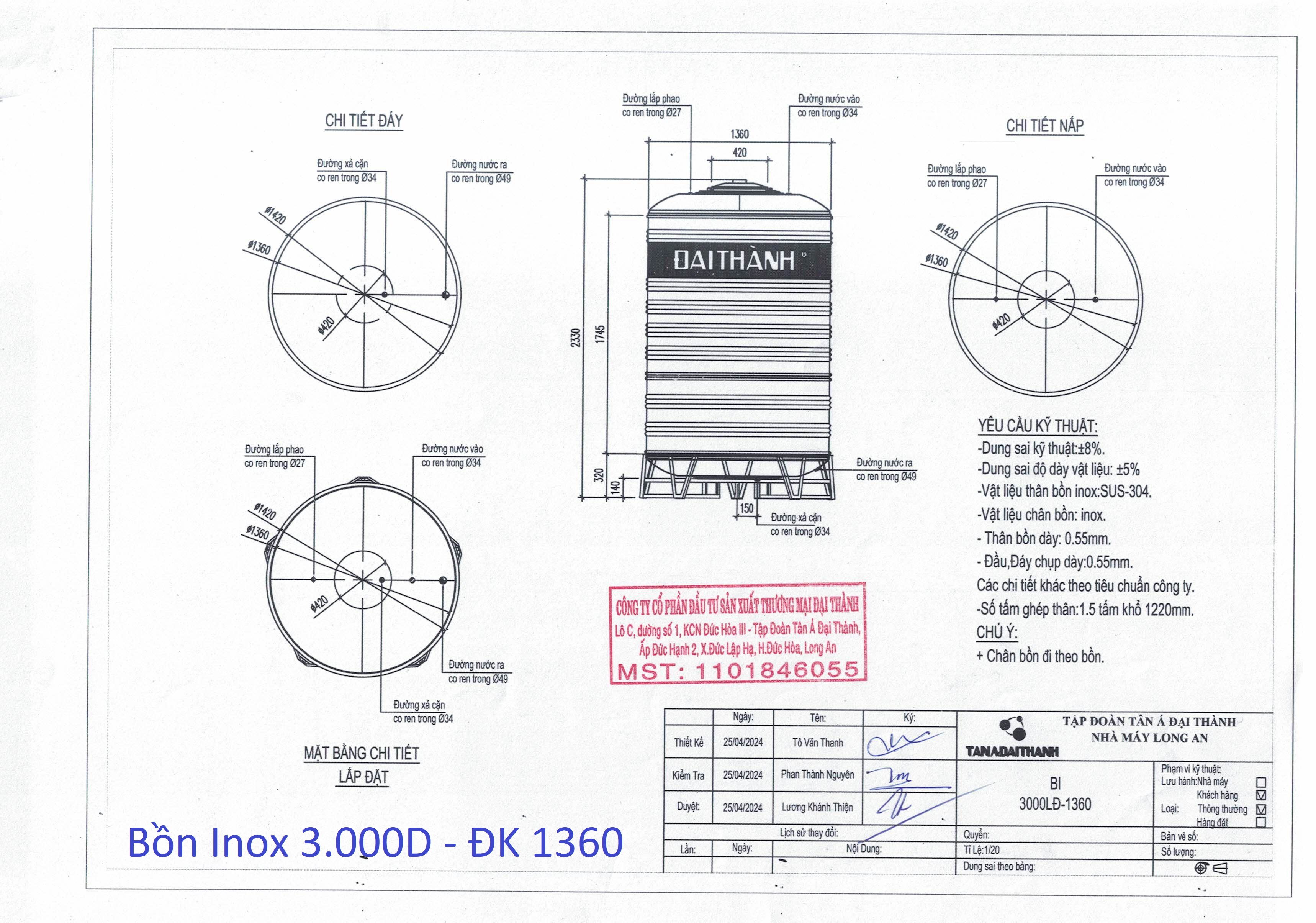 - Bồn nước Inox Đại Thành. Chất liệu: Thép không gỉ SUS 304. Bảo hành chính hãng: 12 năm