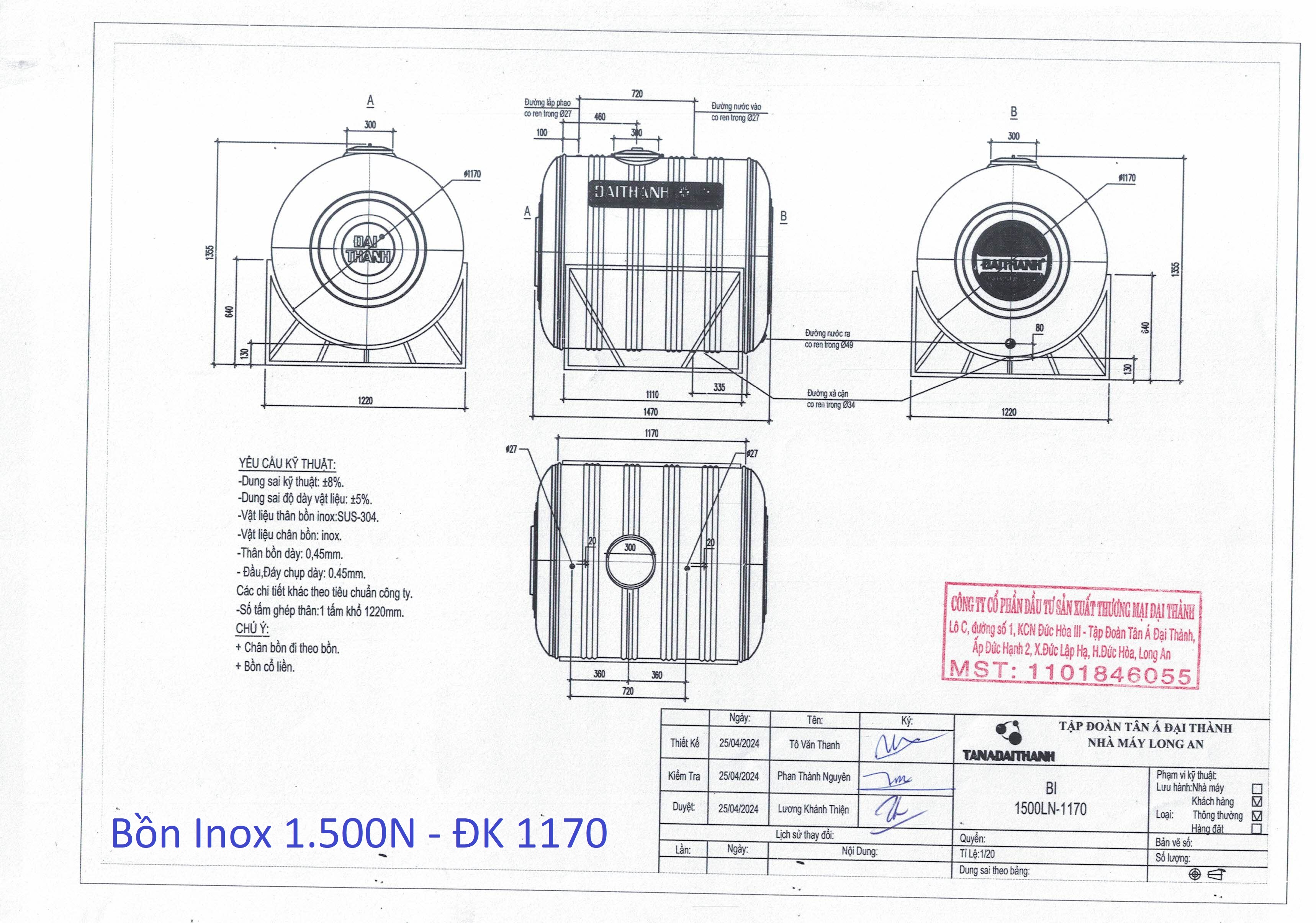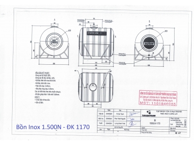BỒN INOX ĐẠI THÀNH 1.500L NGANG
