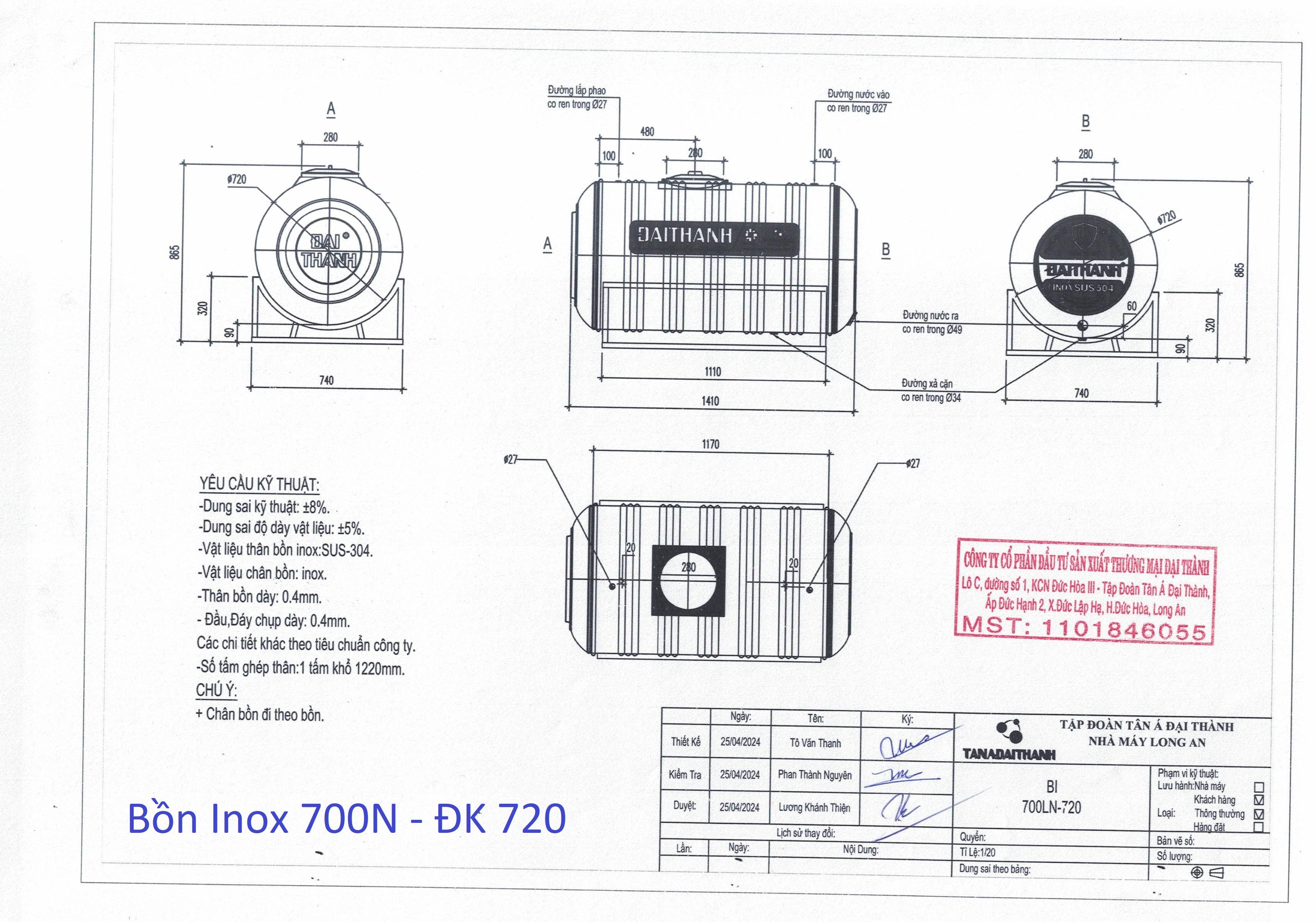 - Bồn nước Inox Đại Thành. Chất liệu: Thép không gỉ SUS 304. Bảo hành chính hãng: 12 năm